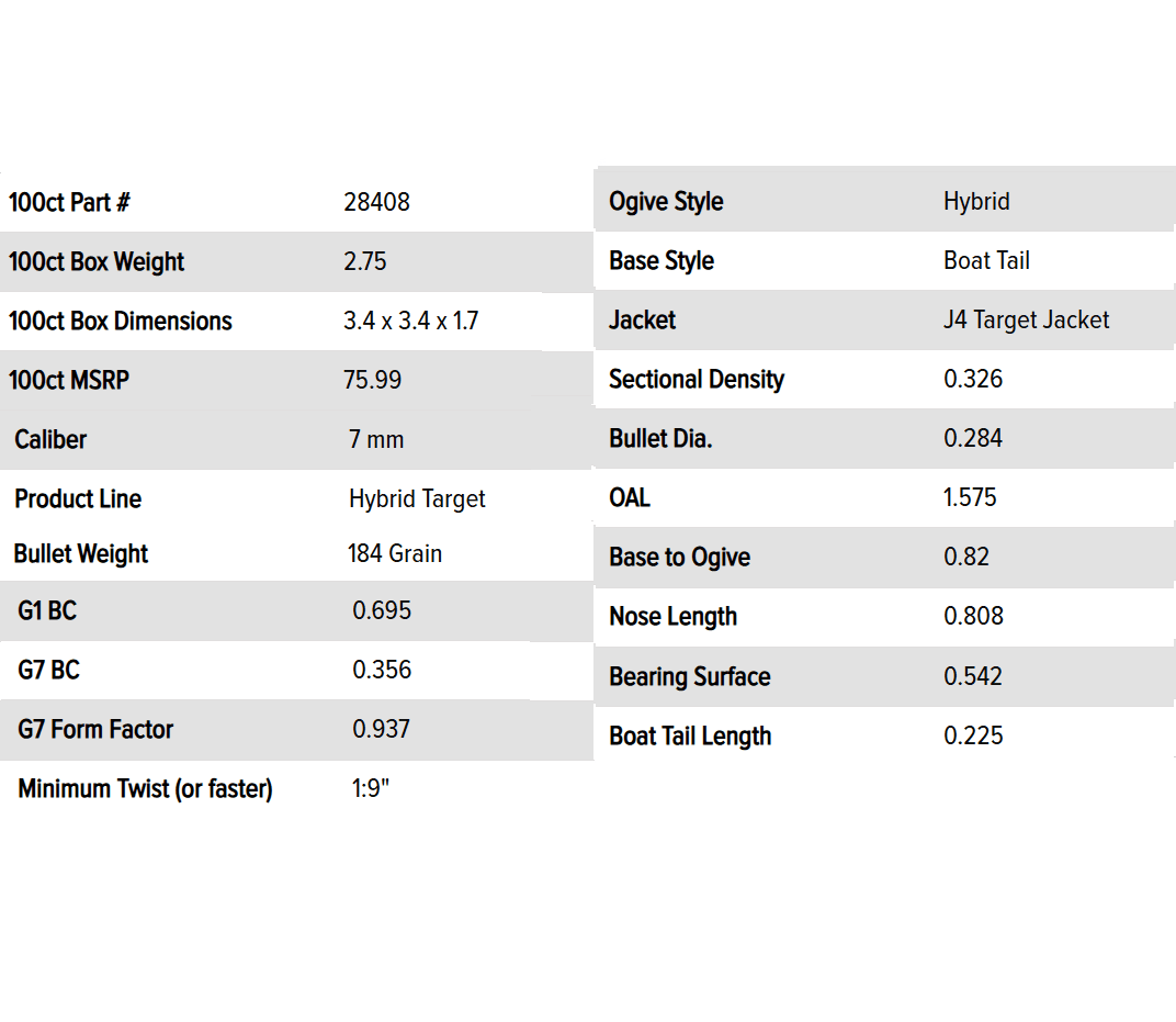 Our renowned ballistician, Bryan Litz, designed the new 184gr F-Open Hybrid to be slightly heavier, slightly longer and have a more aggressive ogive shape; giving it a ballistic advantage to our existing 7mm 180gr Hybrid and VLD Target Rifle Bullet designs. This Rifle Bullet complements the 30 cal 200.20x Hybrid Target Rifle Bullet, which was designed specifically for F-TR. Just like our 200.20x Rifle Bullet, we took an existing design and optimized the ballistic profile to make it even better.